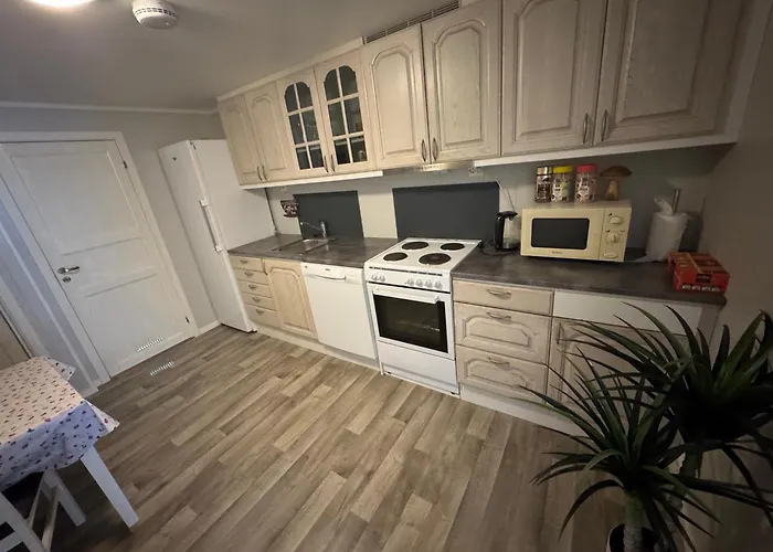 Obiekt noclegowy wyposażony jest w pełnowymiarową kuchnię. Apartament leży w niewielkiej odległości od dworca autobusowego Leknes skole.